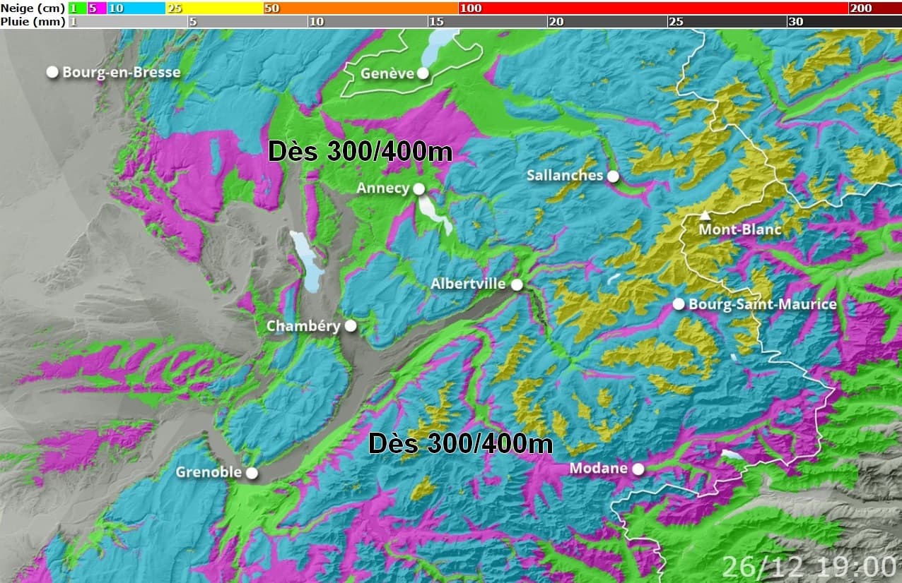 Sur le Nord des Alpes, la neige pourra être observée dès 300/400m d’altitude, notamment en fin de journée du 25 décembre et cours de nuit suivante. Une couche de neige pourrait se déposer jusqu’à Genève et Annecy, ne dépassant pas 1 à 3cm sur ces zones. Dès 500m d’altitude les 10cm pourront être dépassés sur la période, plus de 20cm au-dessus de 1000m.