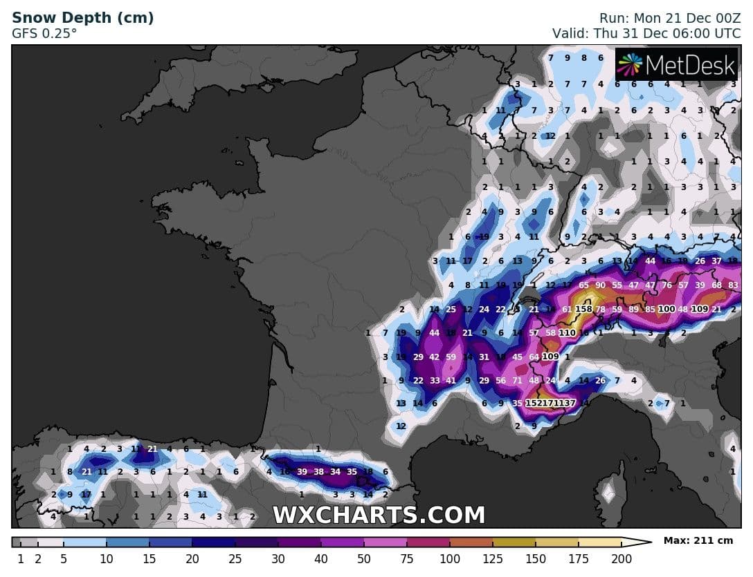 Accumulations neigeuses envisagées pour la dernière semaine de l’année sur la France – Modèle GFS via WX CHARTS (run 00z)