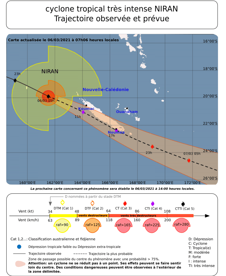Des rafales de 180 à 200km/h sont envisagées sur le littoral, notamment demain après-midi, plutôt 100 à 160km/h sur le reste de la zone. Il n'est d'ailleurs pas complètement exclu que l'oeil de NIRAN, avec les vents les plus destructeurs, touche la Grande Terre.
