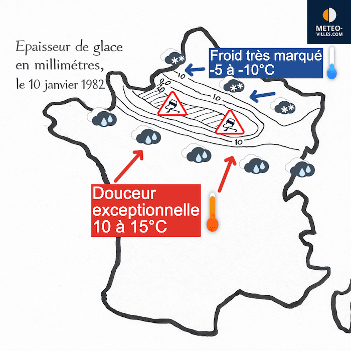 Début janvier 1982, une situation météorologique exceptionnelle se met en place. Une masse d’air froid massive recouvre l’Europe du Nord, tandis qu’une masse d’air exceptionnellement doux remonte d’Europe du Sud. La Normandie, l’Île-de-France et la Bourgogne se retrouvent au cœur de ce conflit de masses d’air, avec une différence de températures d’environ 20°C sur seulement 300 km ! Ce bras de fer entre l’air froid et l’air chaud est si intense que le front stationne sur ces régions pendant plusieurs jours, provoquant d’importantes précipitations sous forme de neige, de pluies verglaçantes ou de pluie.
