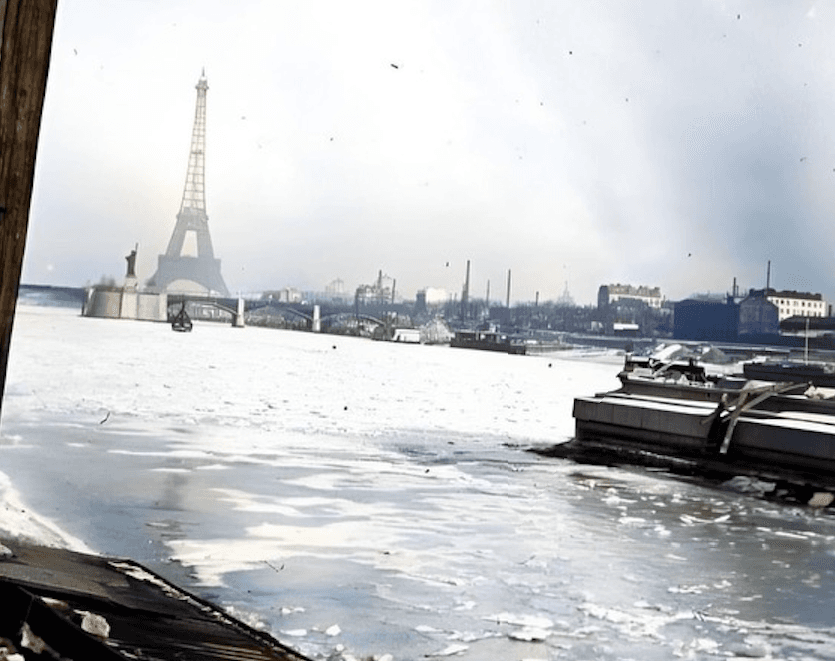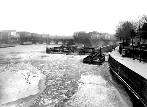 En janvier 1917, en pleine Première Guerre mondiale, plusieurs photos montrent la Seine gelée aux abords de Paris et jusque dans le centre, près du pont Saint-Michel. On y voit des plaques épaisses s’entrechoquer, des péniches bloquées et une brume glacée sur la ville.