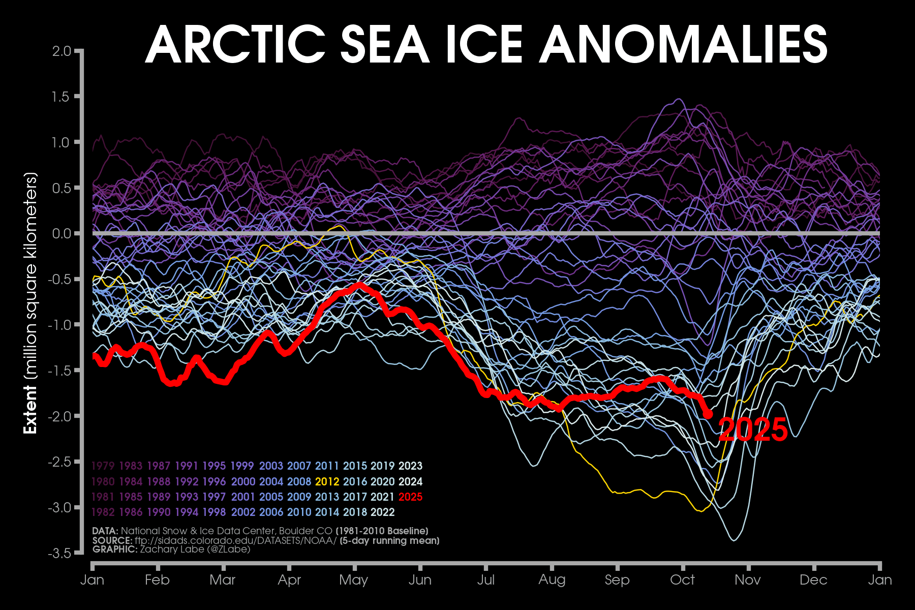 Anomalie de superficie de la banquise par année depuis 1979 (2025 en rouge) - via zacklabe.com