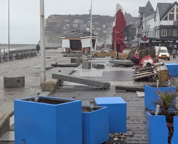 Dégâts parfois importants en Seine-Maritime la nuit dernière suite au passage de la tempête Goretti - ici, le front de mer à Fécamp en Seine-Maritime après la grosse houle subversive de la tempête Goretti. La station du sémaphore a mesuré 157 km/h ! (© Le Phare à Images)