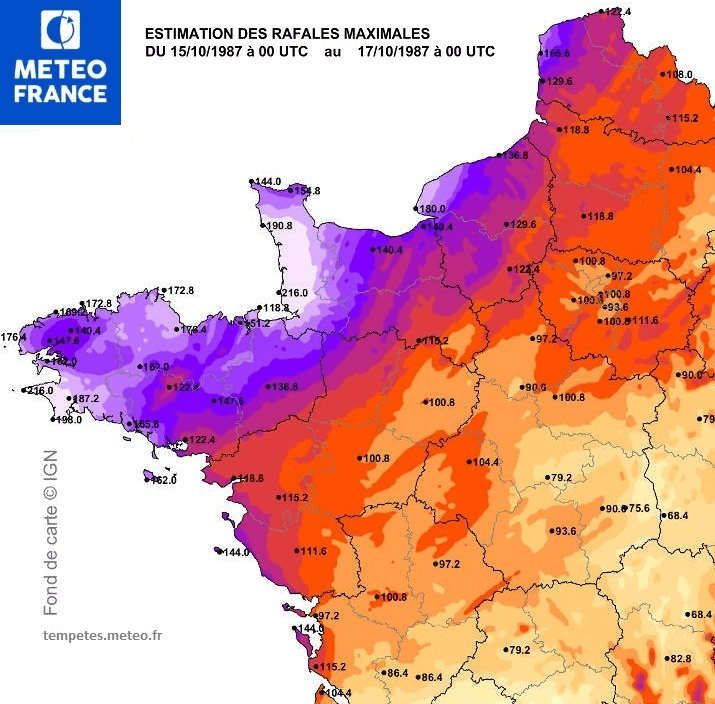 Rafales de vent maximales lors de "l'ouragan de 1987" - Météo-France
