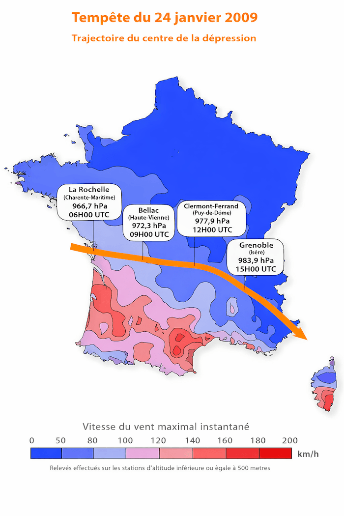En quelques heures, la tempête balaie les Landes, la Gironde, les Pyrénées-Atlantiques, puis poursuit sa route vers la Méditerranée. Le scénario rappelle les grandes tempêtes de 1999, avec une intensité comparable, voire supérieure par endroits.