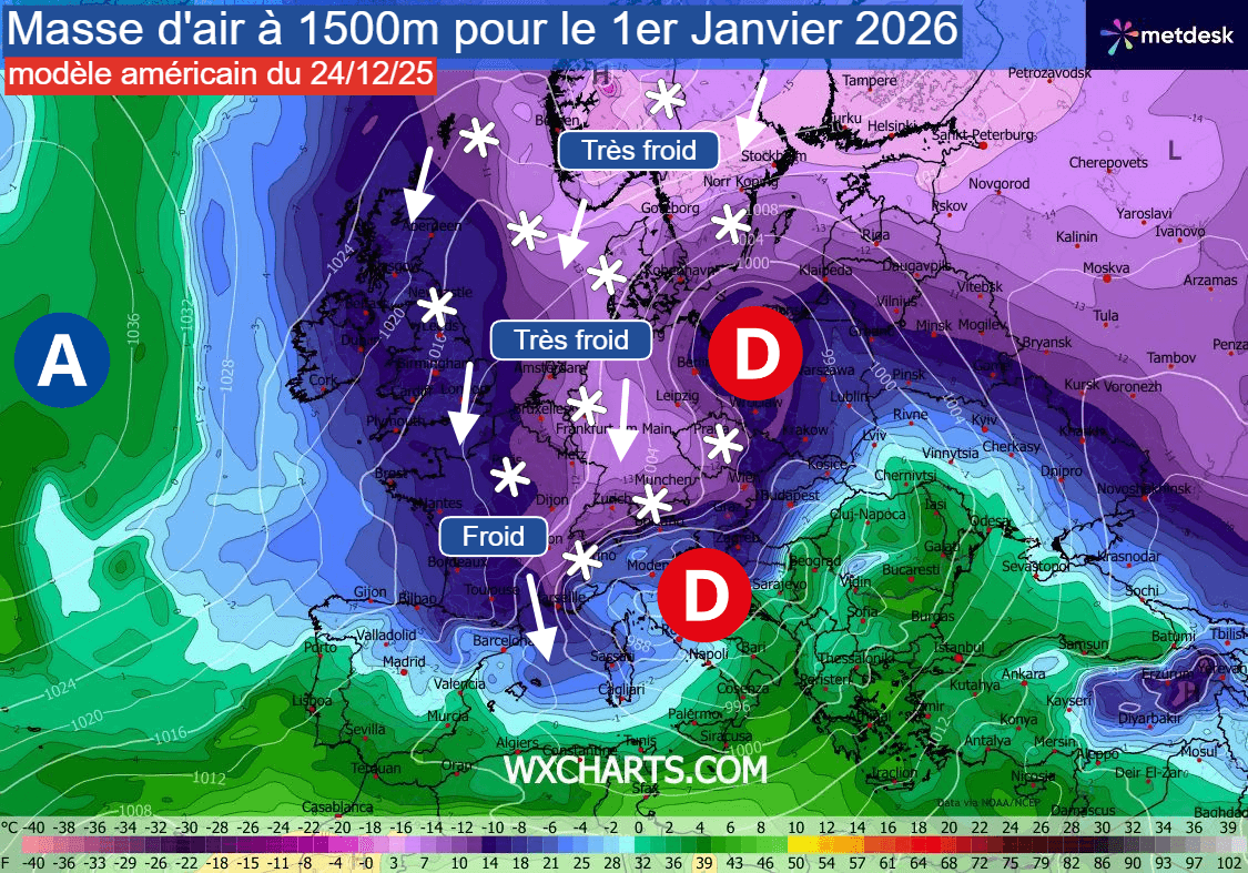 Masse d'air à 1500m vue par le modèle américain du 24/12/25 pour le 1er janvier 2026 - wxcharts.com