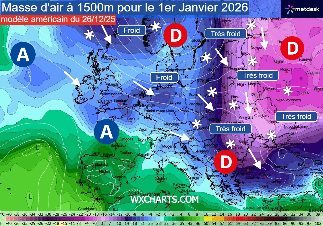 Masse d'air à 1500m vue par le modèle américain du 26/12/25 pour le 1er janvier 2026 - wxcharts.com