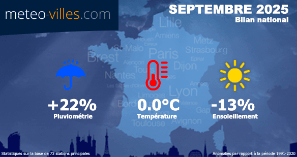 Et pourtant, septembre vous a paru particulièrement frais ? Ceci peut s'expliquer par un important contraste entre la première et la seconde partie du mois. Bien que fluctuantes, le thermomètre affichait encore régulièrement des valeurs estivales durant les deux premières décades (+0.9°C du 1er au 20 septembre), avec même un pic de fortes chaleurs les 18 et 19 septembre (jusqu'à 35.2°C à Bordeaux ou encore 30.4°C pour Paris >>).