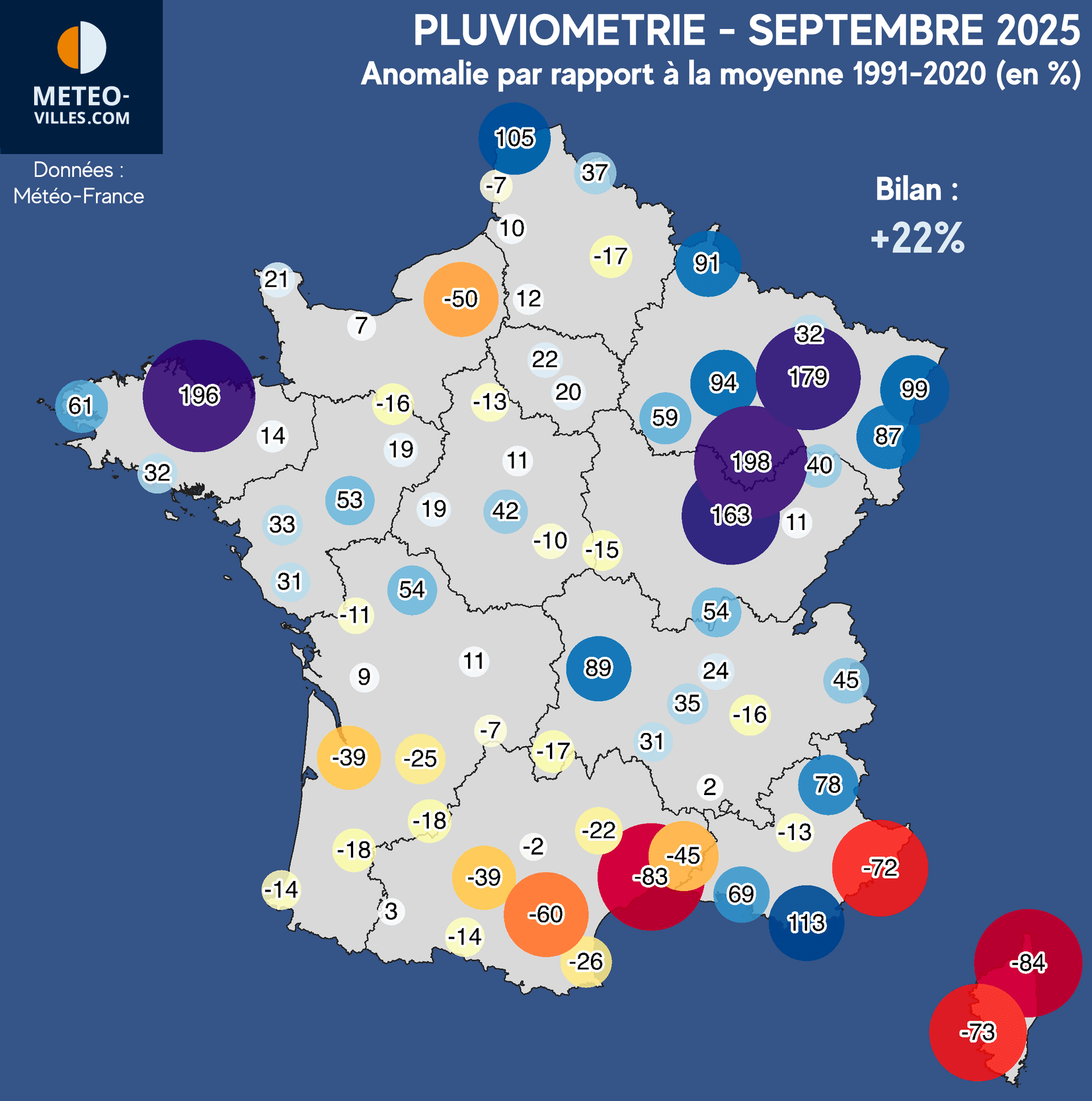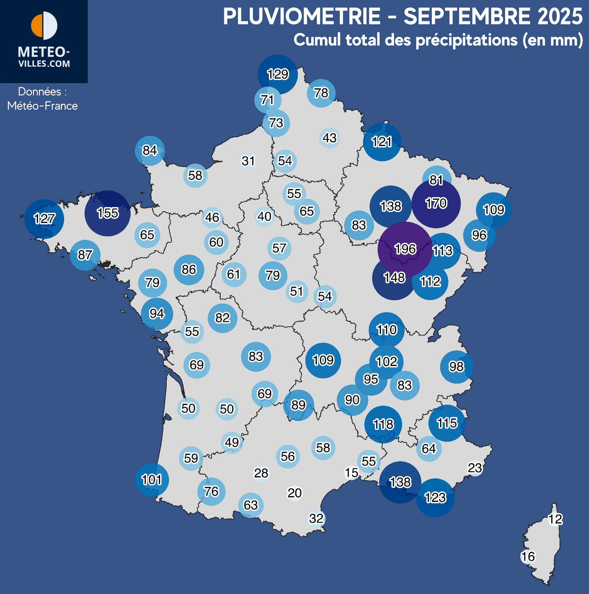 Toutes les zones les plus arrosées ont récolté en règle général plus de 100mm au cours du mois. En dehors du nord de la Bretagne et sur le Pas-de-Calais, c'est toute la moitié Est de la France qui a vu le plus de précipitations durant le mois. Entre Bourgogne-Franche-Comté et Grand-Est, le cumul atteint même 170mm pour Nancy record pour septembre) et 196mm pour Langres, et dépasse les 200mm sur une poignée de stations du réseau secondaire. Le maximum est pour une station d'altitude avec 310mm au Ballon-de-Servance (Haute-Saône). A noter qu'en Alsace et en Lorraine, il s'agit du mois de septembre le plus humide depuis plus de 40 ans (1984).