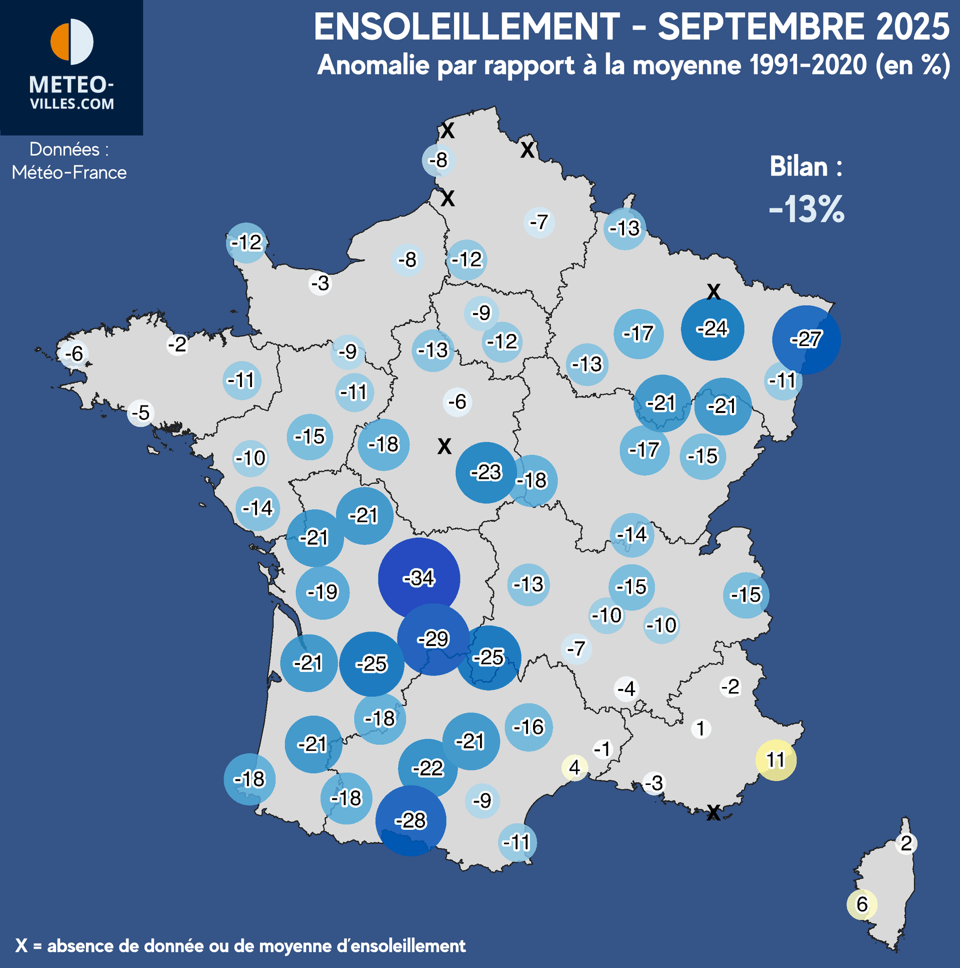 Contrairement à la pluviométrie, le déficit d'ensoleillement est ici quasi-généralisé pour ce mois de septembre. Il atteint même de -20% à -30% sur une large bande allant du Sud-Ouest au Nord-Est (-21% à Bordeaux et Langres, -22% à Toulouse, -25% à Aurillac, -27% à Strasbourg, -28% à St-Girons, -29% à Brive et jusqu'à -34% à Limoges).