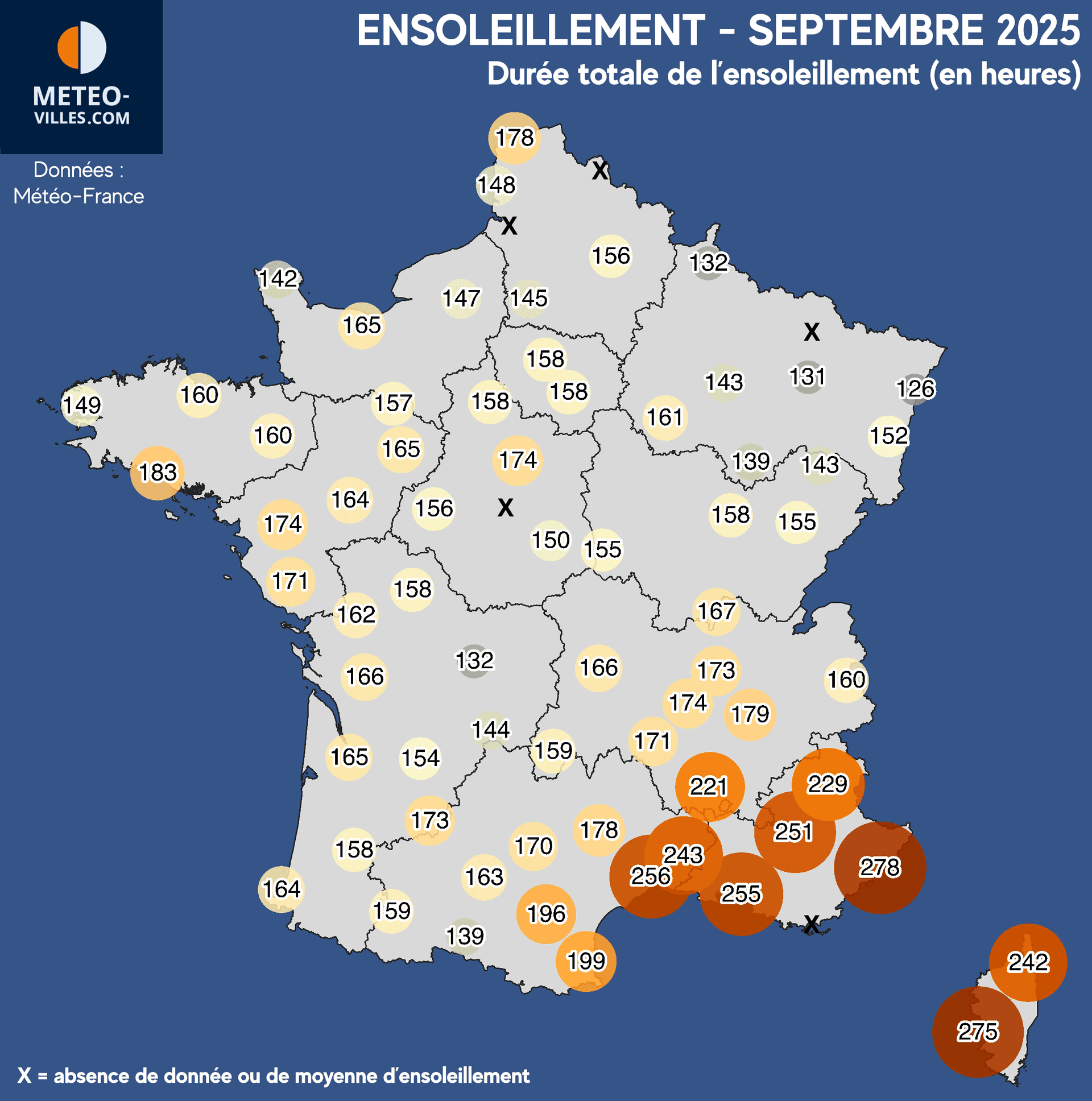Un pourtour Méditerranéen qui reste donc le secteur le plus ensoleillé, avec plus de 200 voire même 250 heures de soleil au cours du mois écoulé (jusqu'à 255h à Marseille-Marignane, 256h à Montpellier, 275h à Ajaccio, 278h à Nice, et même 282h dans le Var sur l'île du Levant).