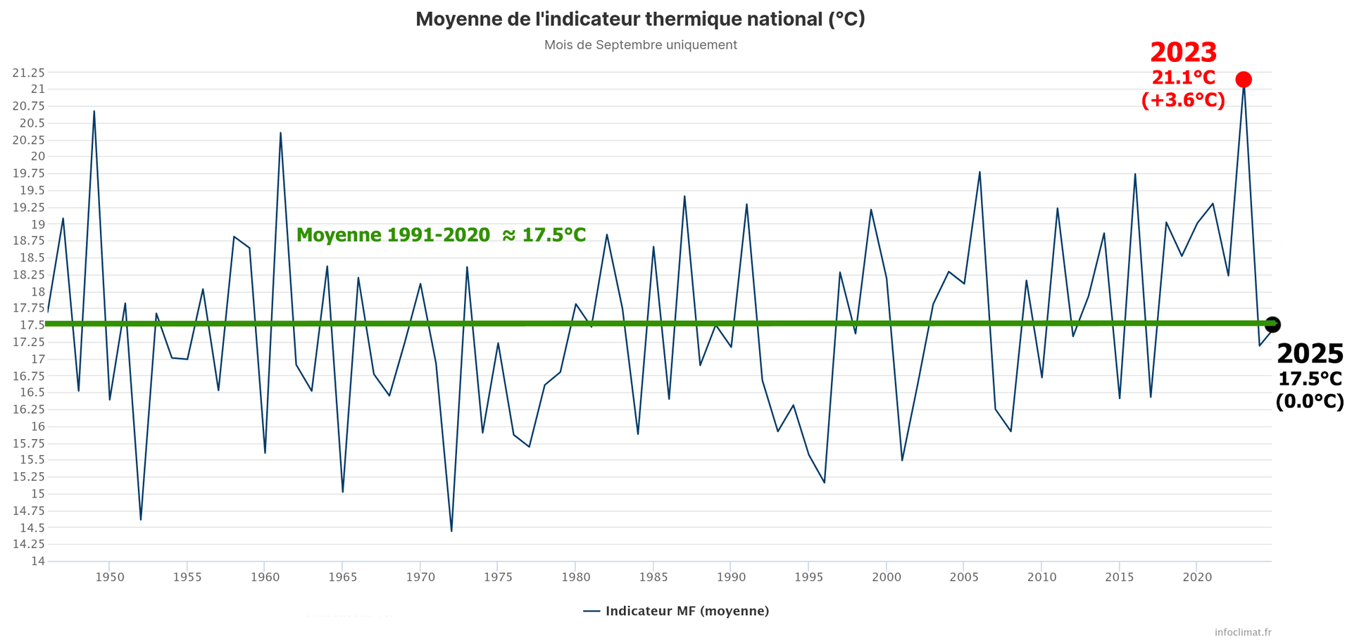 Indicateur thermique national pour septembre 2025 depuis l'après-guerre (1945) - Infoclimat