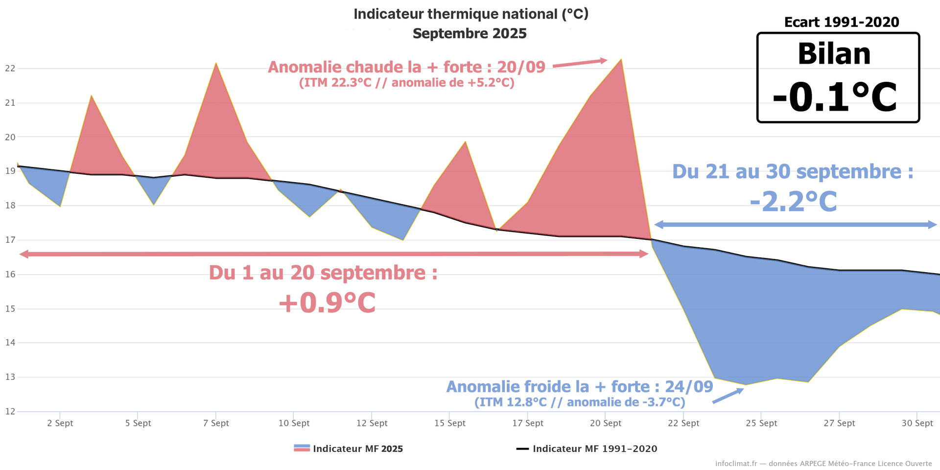 C'est un fait assez rare pour être signalé... mais les températures sur l'ensemble de ce mois de septembre sont conformes aux moyennes de saison ! En effet, avec un indicateur thermique national d'environ 17.5°C, nous nous situons dans les normes de la période 1991-2020. Nous restions sur 11 mois consécutifs en excédent thermique, le dernier mois en-deça des moyennes remontant à septembre 2024 (-0.3°C). Un second mois consécutif de septembre sans excédent de température... bien loin de septembre 2023 qui reste le plus chaud observé en France (+3.6°C).