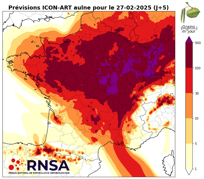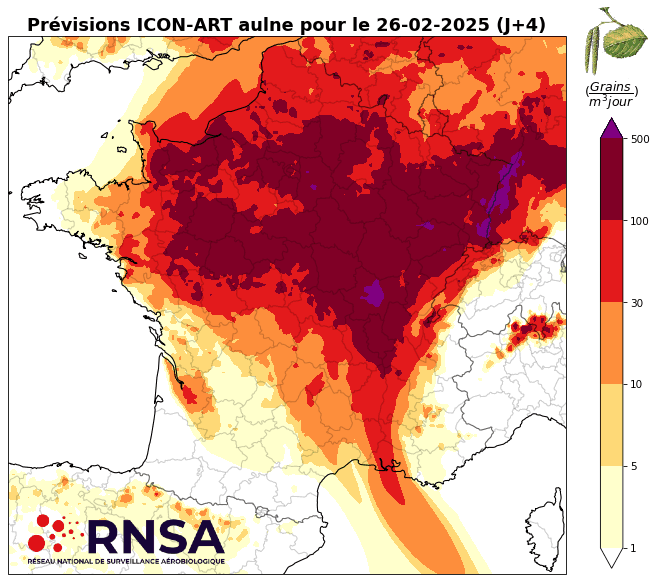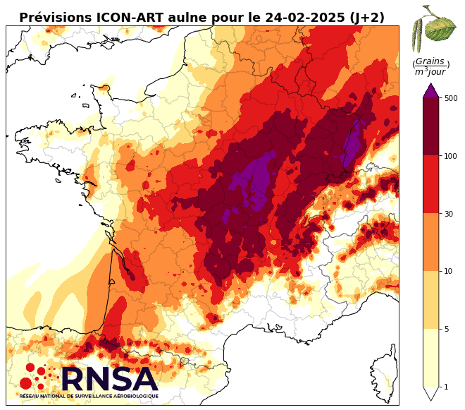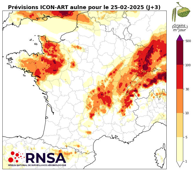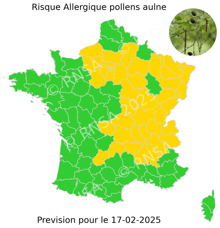 Prévisions du risque d'allergie aux pollens d'Aulne pour mardi 25, mercredi 26 et jeudi 27 février 2025