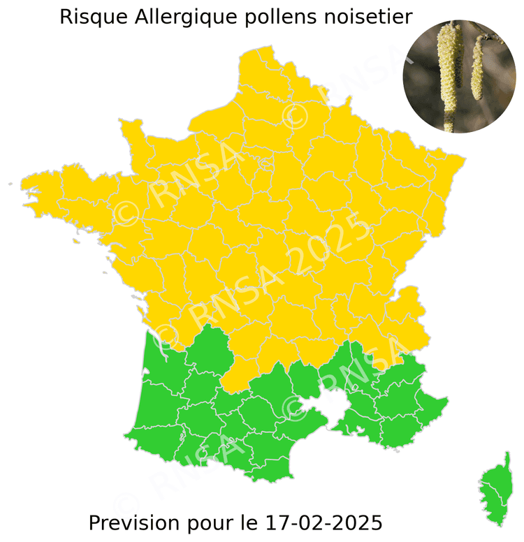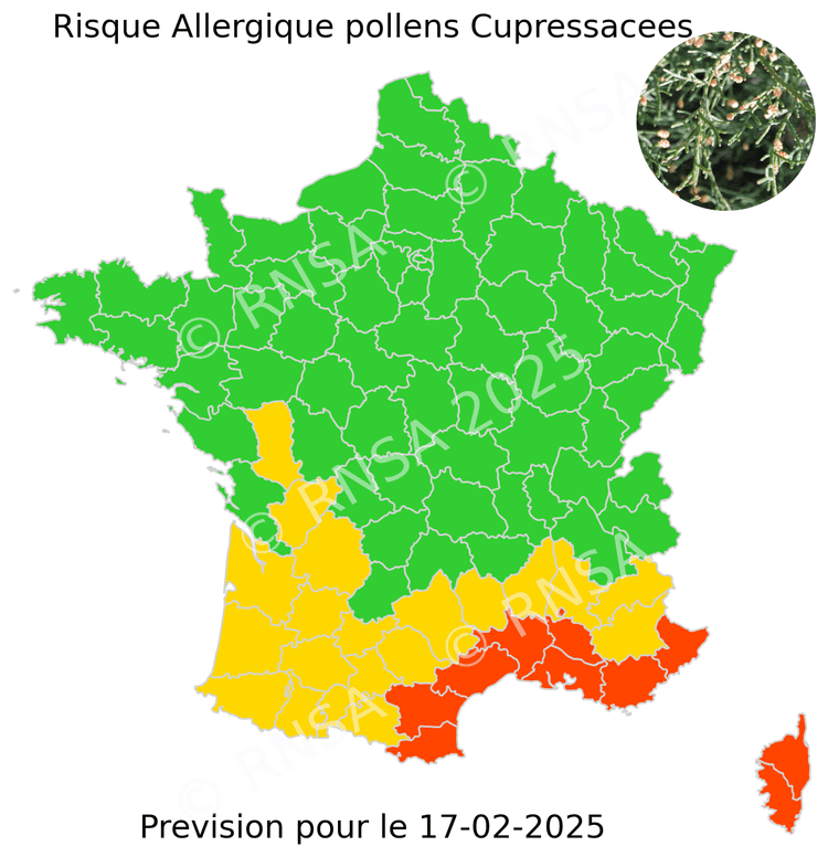 Depuis la mi-février, on observe donc principalement des pollens de Noisetiers, d’Aulnes, et de Fresnes ainsi que de Cupressacées dans le Midi - notamment près de la Méditerranée (Cyprès)