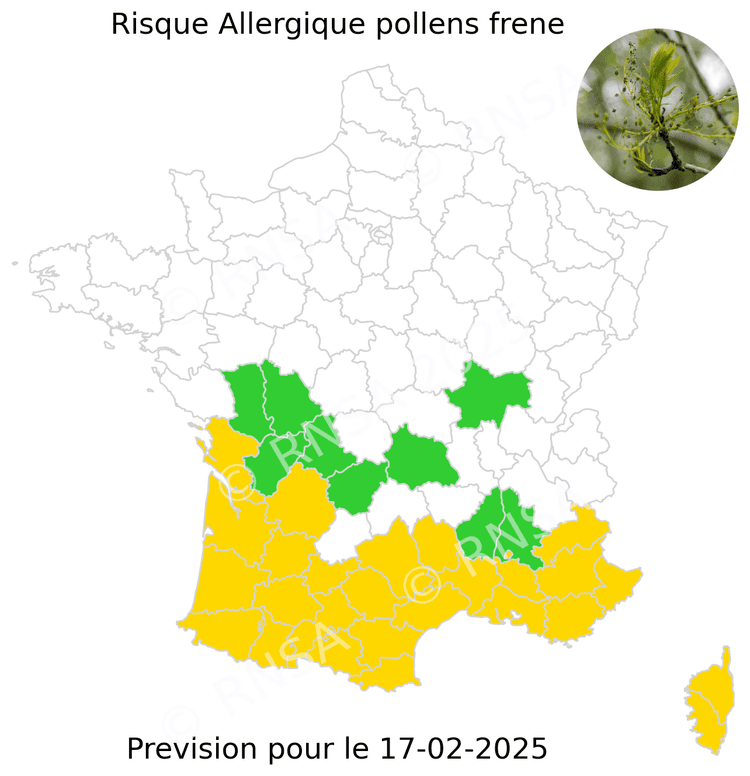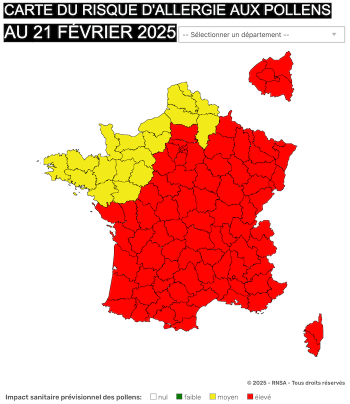 Quasiment toute la France est concernée par ce risque allergique, même si les départements du Nord-ouest (par leur climatique plus frais) sont les derniers.
