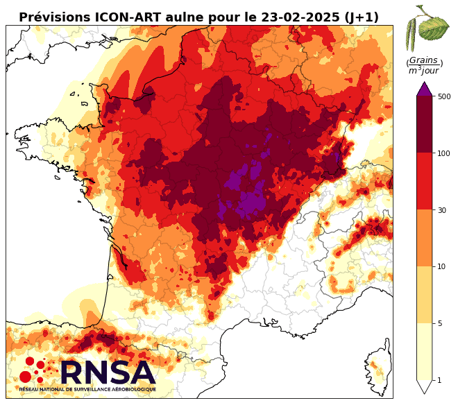 Prévisions du risque d'allergie aux pollens d'Aulne pour dimanche 23 et lundi 24 février 2025