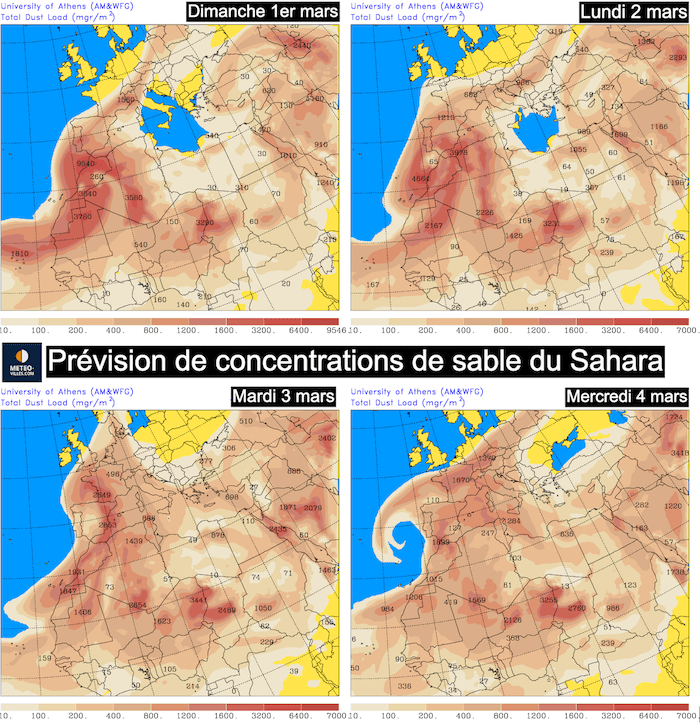 Prévisions des remontées de sable du Sahara entre le 1er et le 4 mars - météo grecque (université d'Athènes)