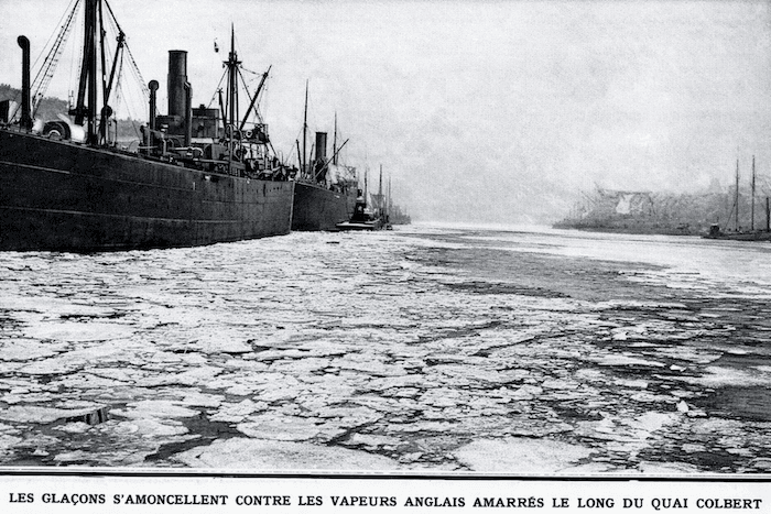 Les rivières de l’Est commencent à geler le 24 janvier, tandis que celles du Nord, y compris celles de la région parisienne, le sont dans les derniers jours de janvier, un phénomène inédit depuis 1895. La navigation devient impossible sur les canaux puis sur la Seine. Parallèlement, la forte demande en charbon engendre d’importantes difficultés d’approvisionnement à Paris, comme à Londres. Malgré l’utilisation de quelques brise-glace et la construction de barrages pour retenir les glaces près de Rouen, les péniches restent bloquées entre Rouen et Paris. Un service spécial de transports automobiles est alors mis en place.