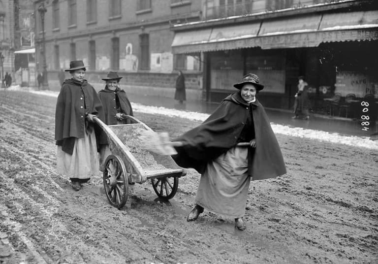 A Paris, le déneigement des voies de circulation est très compliqué en raison du manque de main-d’œuvre. Les femmes sont alors réquisitionnées. Février 1917 - archives meteo-paris.com