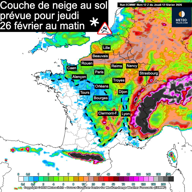Simulation de l'épaisseur de neige prévue pour jeudi 26 février au matin par le modèle météo européen - Meteociel