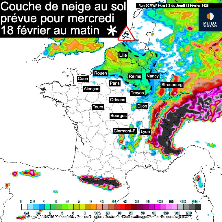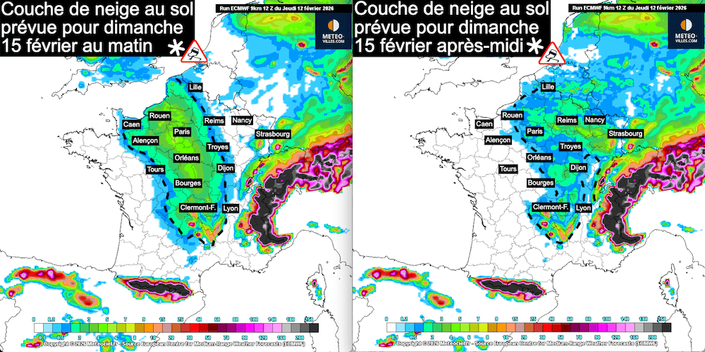 Nous avons choisi de vous présenter des cartes précises d’épaisseur de neige prévue d’ici la fin du mois de février, non pas par démagogie (car nous sommes conscients que ces scénarios évolueront dans les prochains jours), mais pour illustrer la tendance qui se dessine pour la fin du mois. En effet, tous les modèles météorologiques prévoient au moins deux ou trois épisodes de neige en plaine, bien que les timings, les épaisseurs et les régions concernées varient d’un modèle à l’autre. Nous avons opté pour le scénario du modèle météorologique européen, car il sert de référence aux prévisions nationales, même s’il est loin d’être parfait.