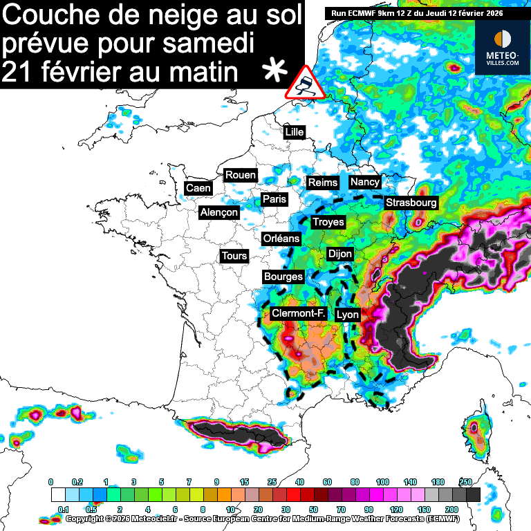 Simulation de l'épaisseur de neige prévue pour samedi 21 février au matin par le modèle météo européen - Meteociel