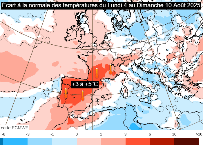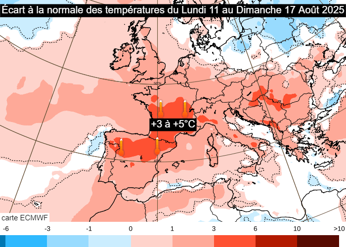 Ainsi, une forte anomalie chaude se dessine d'ores et déjà pour la semaine prochaine, du lundi 11 au dimanche 17 août 2025. Dans une large moitié sud de l'hexagone, l'anomalie thermique sur 7 jours serait de l'ordre de +3 à +5°C. Ainsi, les fortes chaleurs seraient tenaces. Plus on irait vers Rhône-Alpes, le midi-toulousain et la Méditerranée et plus le risque du maintien de températures excessivement élevées serait important. À l'inverse, les températures pourraient être plus raisonnables en allant vers la Manche ou les frontières du nord.