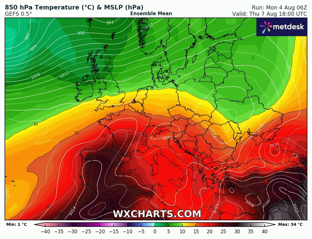Lorsque l'on s'intéresse aux tendances à plus long terme, on constate que les centres d'actions ne devraient que très peu bouger. En conséquence, les masses d'air - elles aussi - ne devraient que peu se déplacer. L'animation ci-dessous montre la masse d'air vers 1500 mètres du jeudi 7 au vendredi 14 juillet 2025. On constate que notre pays devrait rester sous l'influence de l'air très chaud présent sur l'Espagne et la Méditerranée de manière durable, notamment le sud et plus particulièrement les régions méditerranéennes.