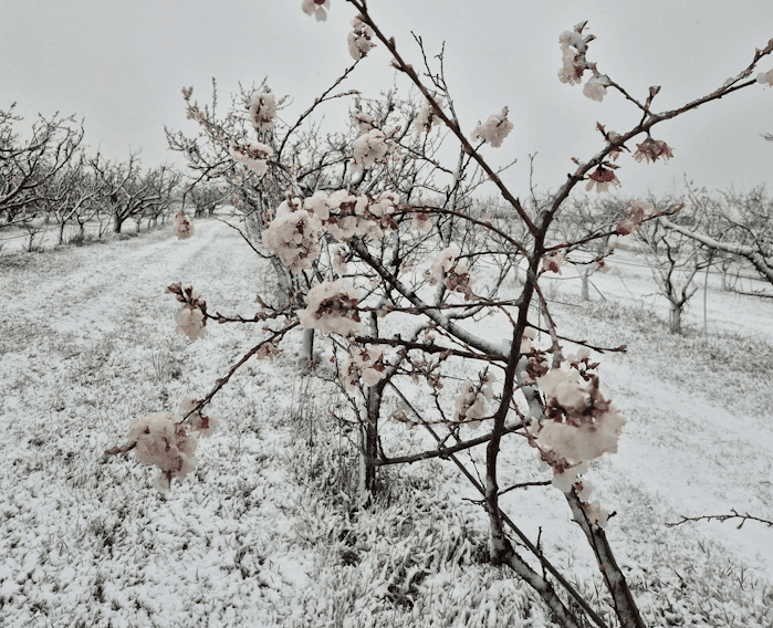 Abricotiers en fleurs sous la neige à Martigny (Suisse) à 400 mètres d'altitude ce jeudi 26 mars 2026 - photo Georges Delaloye