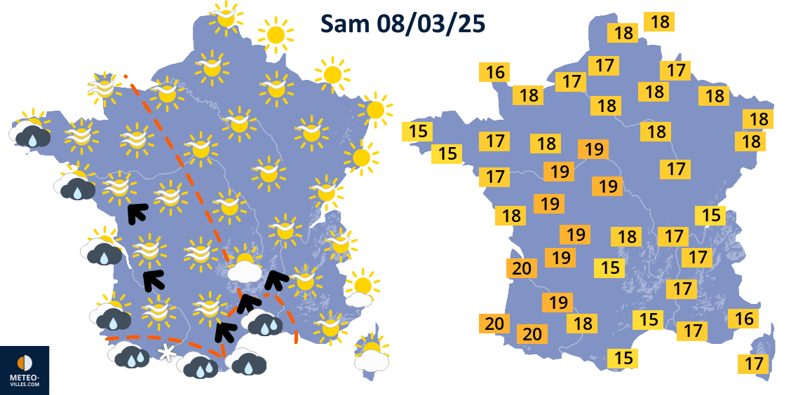 Prévisions météo et températures maximales pour le samedi 8 mars 2025 - Météo Villes