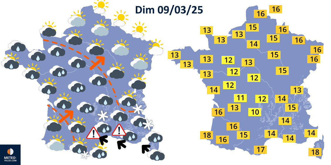 La journée du dimanche 9 mars 2025 marquera une dégradation. Un front pluvieux s'enfoncera du sud-est au nord-ouest de la France avec une activité sensiblement plus importante des Cévennes à la Provence et à la côte d'Azur où les intensités pluvieuses seront marquées. En conséquence, les températures s'orienteront à la baisse sous les nuages et la pluie. Les frontières du nord-est devraient tirer leur épingle du jeu, conservant éclaircies et douceur printanière.