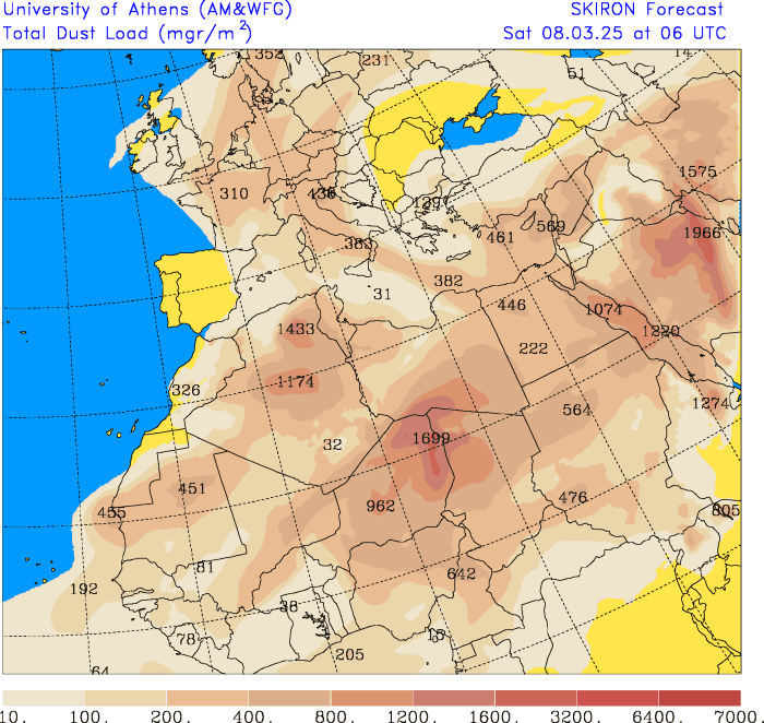 Concentrations de poussières de sable saharien dans l'atmosphère pour le samedi 8 mars 2025 - SKIRON