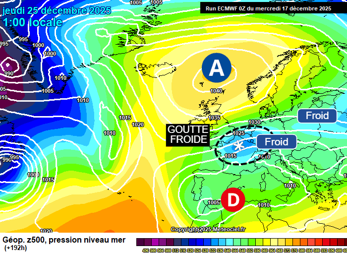 Goutte froide au dessus de la France le jeudi 25 décembre 2025 selon le modèle européen du 17/12/25 - via meteociel.fr
