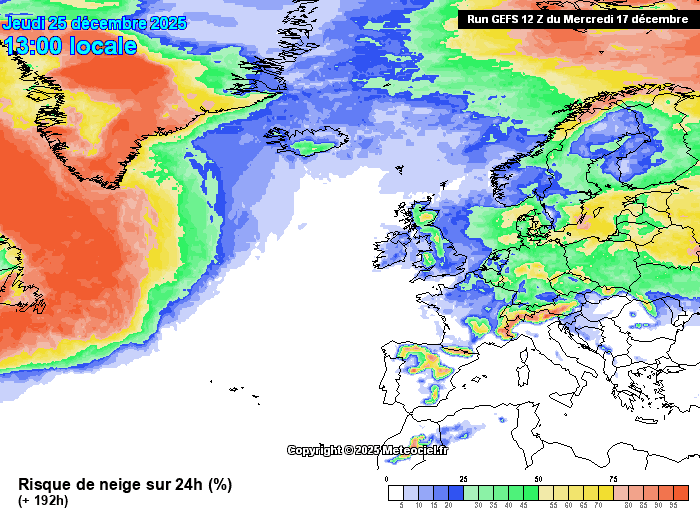 Probabilités de neige pour le jeudi 25 décembre 2025 en tenant compte des différents scénarios - meteociel.fr