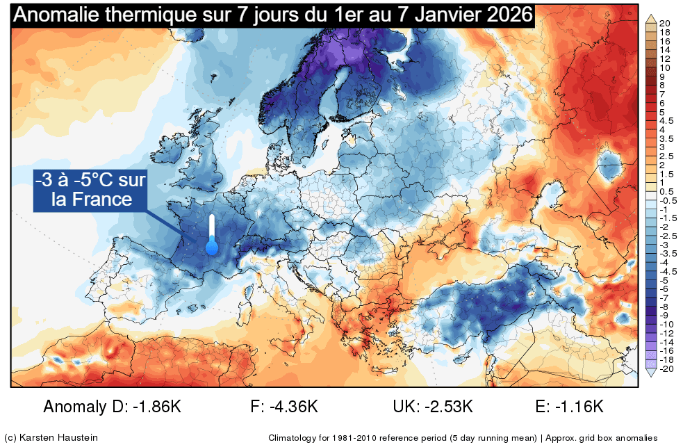 Ce sont donc des températures assez largement inférieures aux moyennes de saison qui nous attendent. Sur les 7 premiers jours de janvier, la France et la Suisse seront les deux pays d'Europe de l'Ouest enregistrant le déficit thermique le plus marqué. Dans l'hexagone, l'écart à la normale sur 7 jours devrait être de -3 à -5°C en moyenne. C'est entre l'océan et les régions de l'est que le déficit sera le plus prononcé, pouvant localement dépasser les -5°C. Autant dire que le froid s'annonce notable.