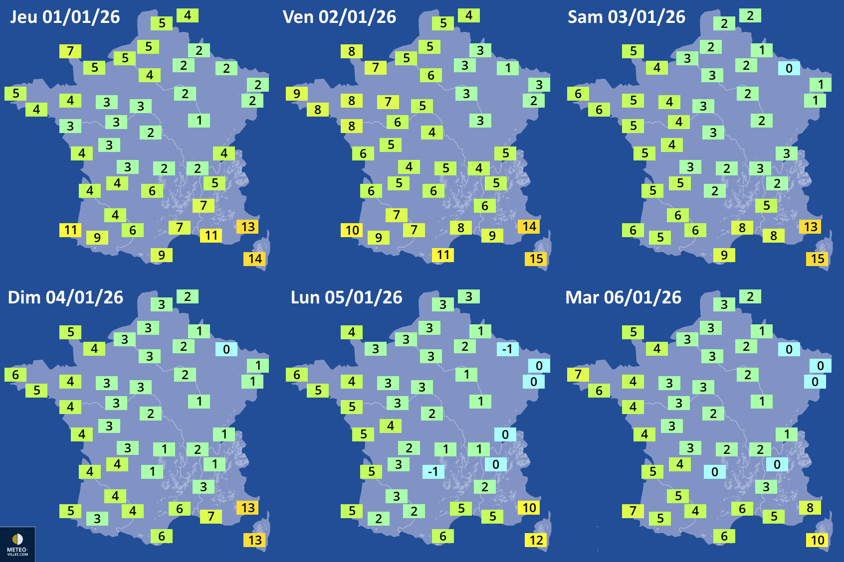 Températures maximales prévues du jeudi 1er au mardi 3 janvier 2026 - Météo Villes
