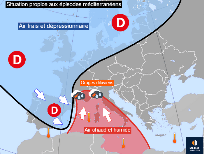 Schéma de la situation atmosphérique favorable aux épisodes méditerranéens sur le sud-est du pays – Météo-Villes
