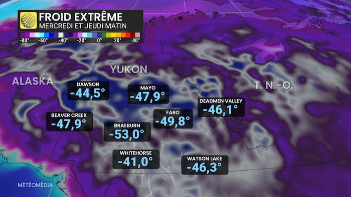 Le Canada a franchi un seuil glacial ce mercredi avec ses premières températures sous les -50 °C, enregistrées au Yukon (Nord-ouest du pays). Mercredi matin, le thermomètre est descendu jusqu’à -53 °C à Braeburn, au Yukon. Il s’agit de la température la plus basse observée au pays depuis le début de l’hiver, en valeur réelle et non en ressenti. Un tel niveau de froid aussi tôt dans la saison n’avait plus été atteint depuis trois décennies. La dernière occurrence comparable remonte au 5 décembre 1995, lorsque la localité de Ross River avait elle aussi enregistré -53 °C.