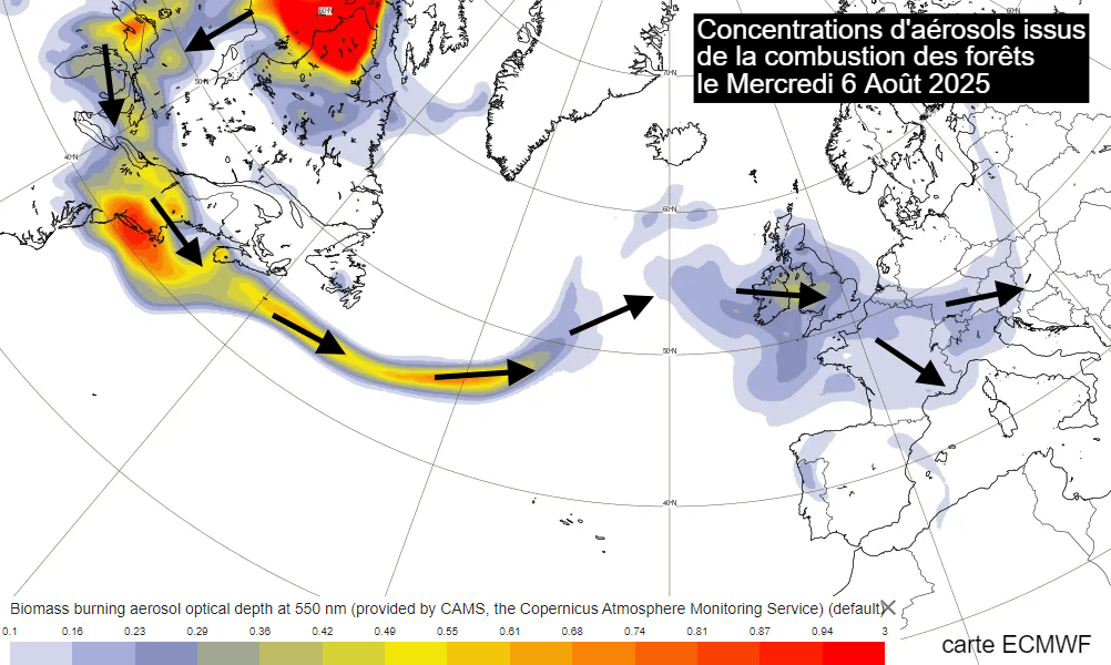Concentrations d'aérosols issus de la combustion des forêts le mercredi 6 août 2025 - ECMWF