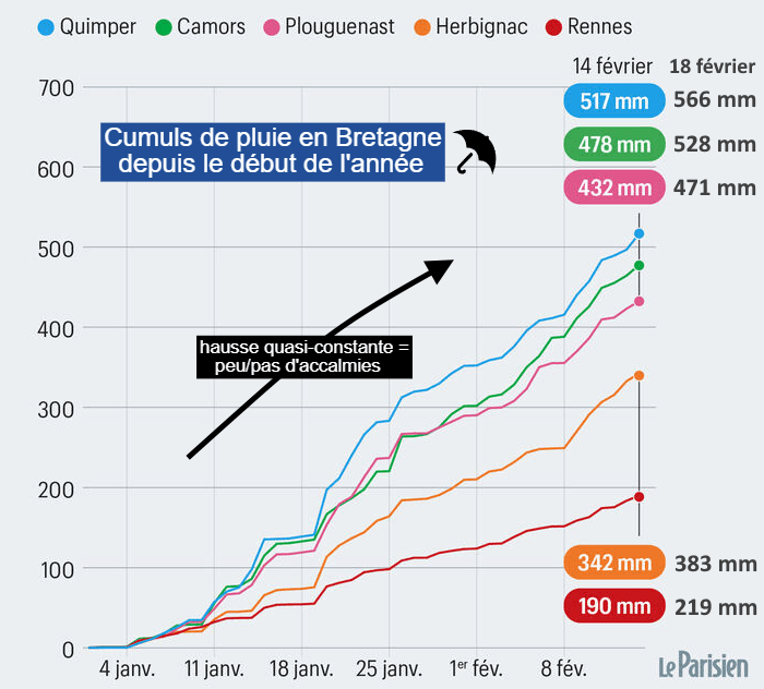 Sur les 45 premiers jours de l'année, 39 ont enregistré au moins 1 mm de pluie en moyenne nationale ! Cela signifie que 87% des jours ont été pluvieux en France depuis le début 2026, un chiffre remarquable ! Non seulement la pluie a été anormalement fréquente mais elle est aussi anormalement abondante. La Bretagne symbolise cet excès de pluie avec des cumuls tout bonnement remarquables. Au 18 février, il est déjà tombé 566 mm de pluie à Quimper depuis le début de l'année ! Cela représente 260% du cumul normal, c'est à dire qu'il est tombé 2,6 fois plus de pluie que lors d'un début d'année moyen ! Jamais de telles pluies n'avaient été observées depuis le début des mesures. Sur le graphique ci-dessous, on note l'absence d'accalmie avec des courbes qui croissent presque continuellement.