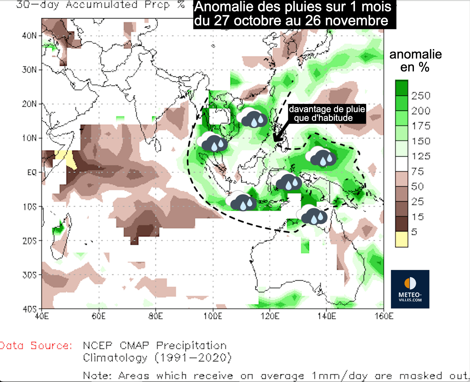 Anomalie des précipitations en Asie entre le 27 octobre et le 26 novembre 2025 - source : NOAA