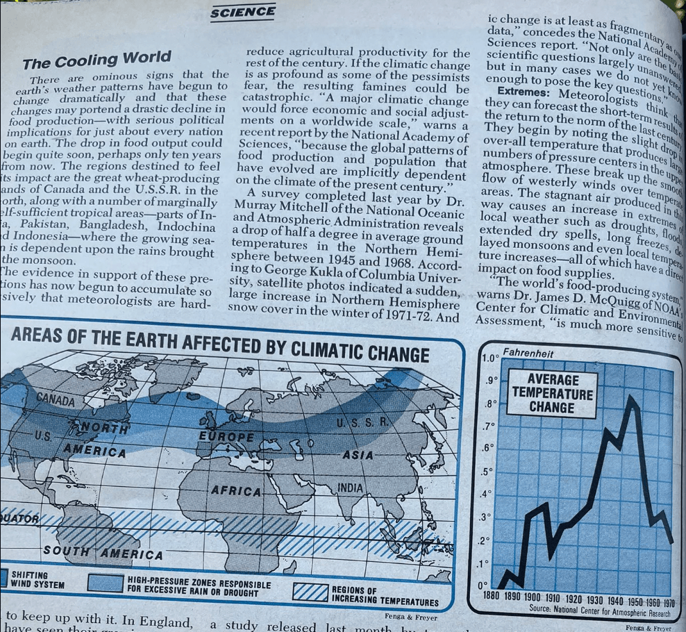 Article de 1975 dans "Newsweek" évoquant le refroidissement climatique et les zones affectées