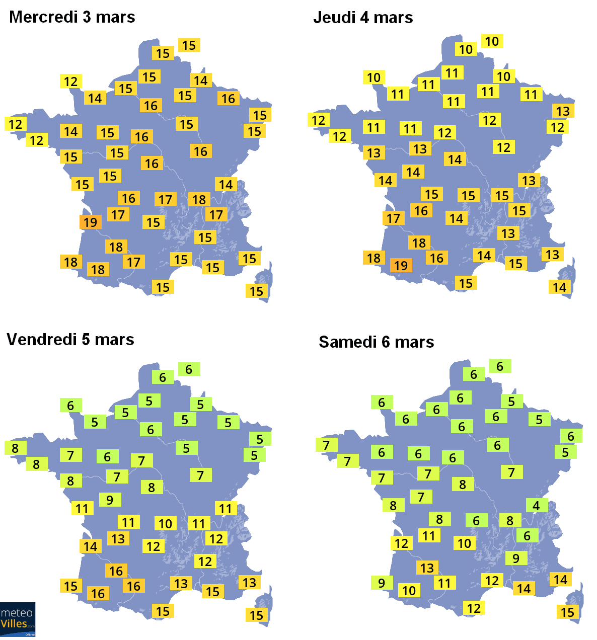 Températures maximales prévues entre mercredi 3 et samedi 6 mars sur la France – Meteo-Villes