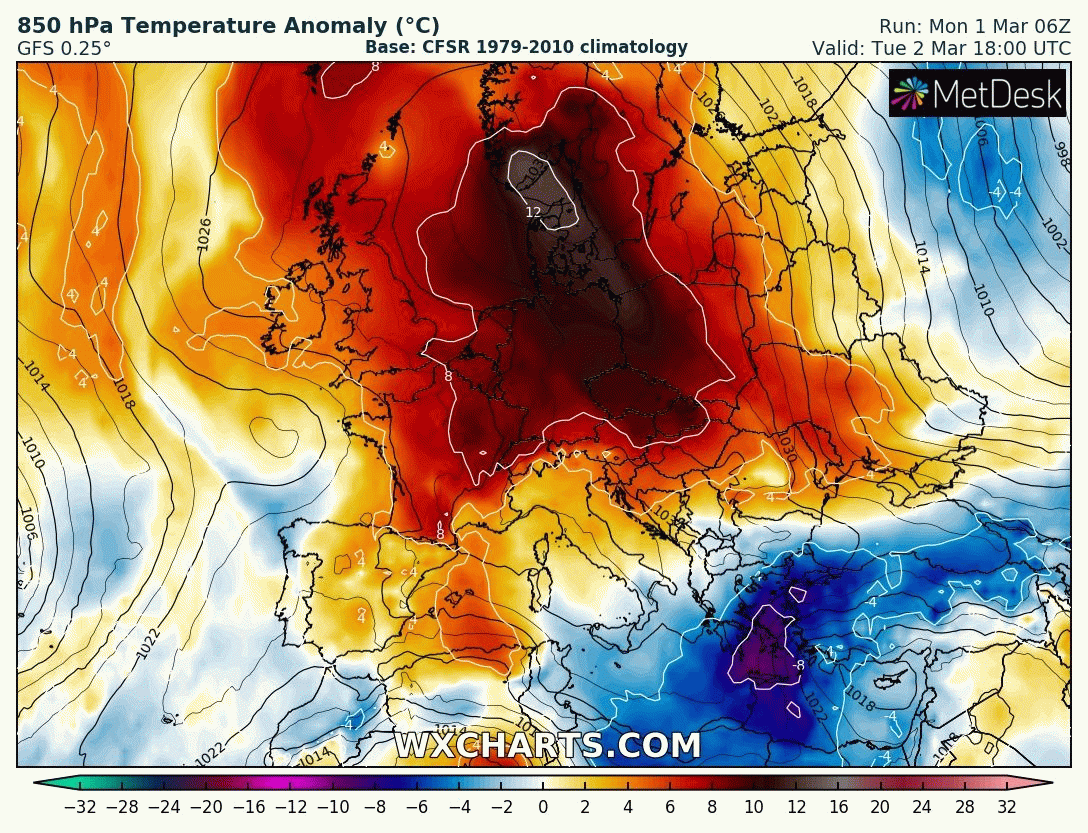 Evolution des anomalies de températures à 850 hPa sur l’Ouest de l’Europe entre le mardi 2 et le samedi 6 mars 2021 – Modèle GFS via WX CHARTS