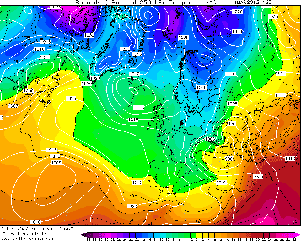 L’impressionnante descente froide de la mi-mars 2013 ! Réanalyse des températures à 850 hPa pour le 14 mars 2013 – Via Wetterzentrale.de