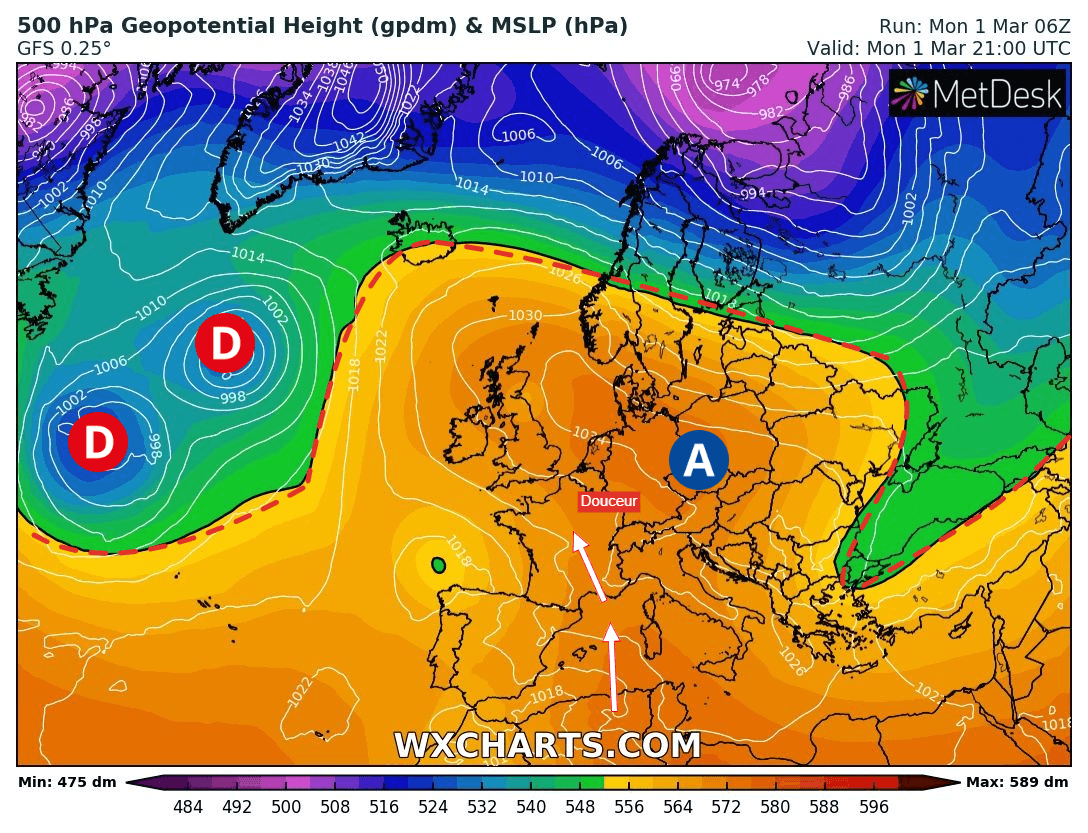 Schéma de la situation atmosphérique sur l’Ouest de l’Europe en ce lundi 1er mars 2021 – Modèle GFS via WX CHARTS