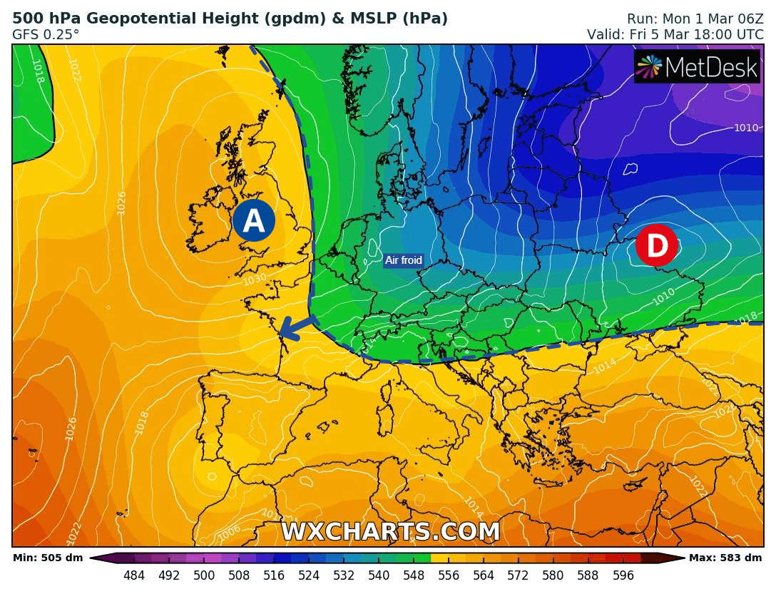 Schéma de la situation atmosphérique sur l’Ouest de l’Europe vendredi 5 mars 2021 – Modèle GFS via WX CHARTS