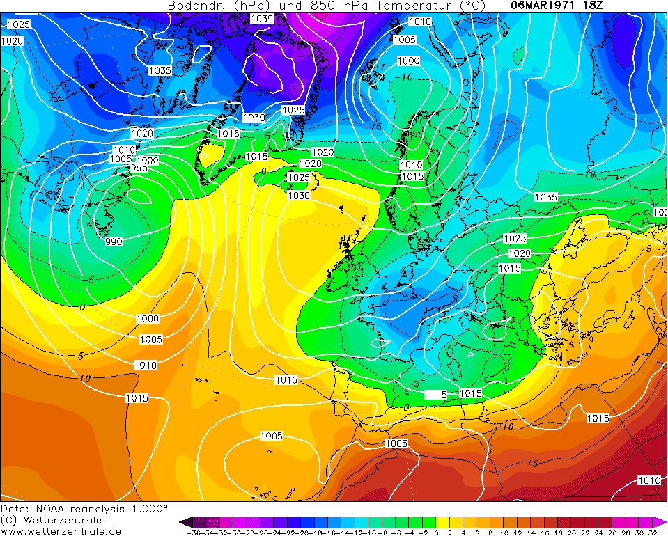 Réanalyse des températures à 850 hPa pressions pour le 6 mars 1971 – Via Wetterzentrale.de