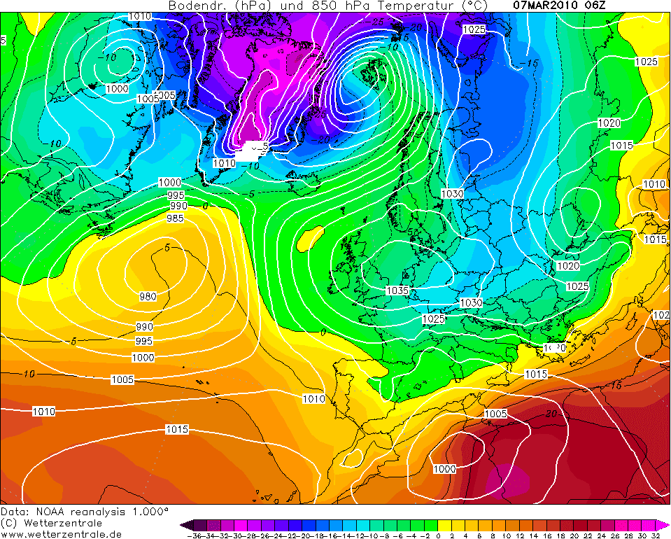 Réanalyse des températures à 850 hPa pour le 7 mars 2010 – Via Wetterzentrale.de